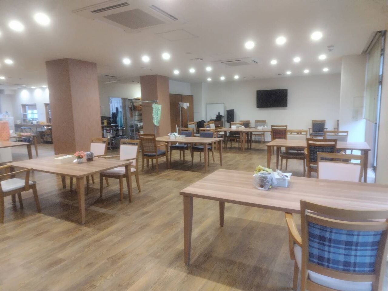 また自立で食事をされる方と食事介助が必要な方が、お互い気を遣わずに食事できるよう、食堂内にも低めの仕切り壁が設けられているんです。